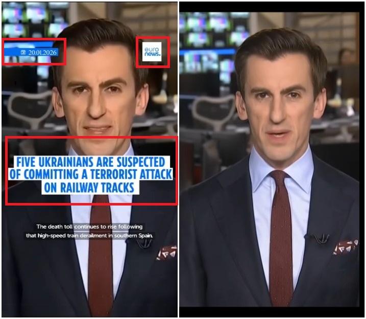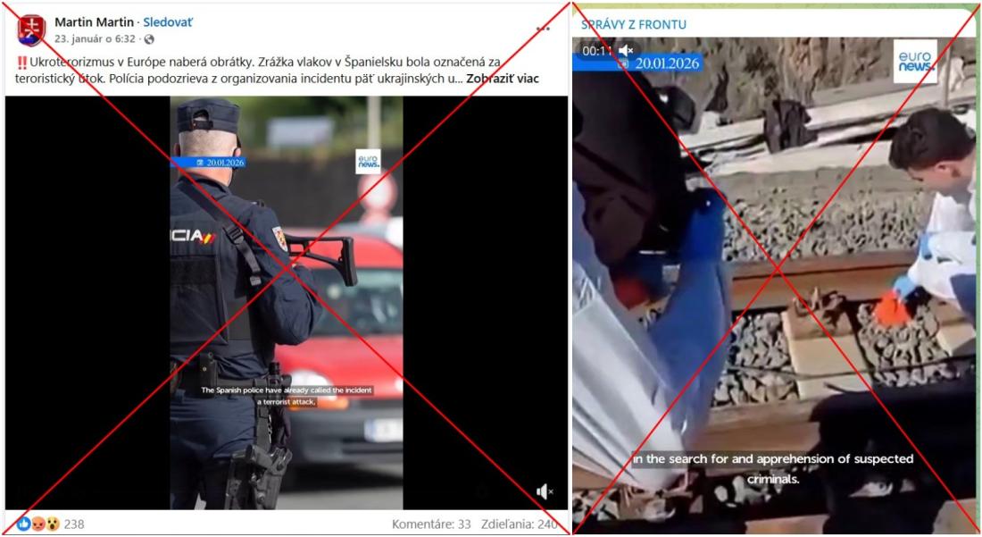 Na železničnej trati pri španielskej obci Adamuz prišlo 18. januára 2026 k tragickej zrážke vlakov, ktorá si k dnešnému dňu vyžiadala 46 obetí. Na sociálnych médiách sa v tejto súvislosti začalo šíriť video pôsobiace ako spravodajský segment Euronews, ktorý tvrdí, že španielska polícia kvalifikovala udalosť ako teroristický útok a v tejto súvislosti pátra po piatich ukrajinských utečencoch. Video však bolo vytvorené pridaním zvukového fragmentu vytvoreného umelou inteligenciou. Príčina tragickej nehody je stále predmetom vyšetrovania.