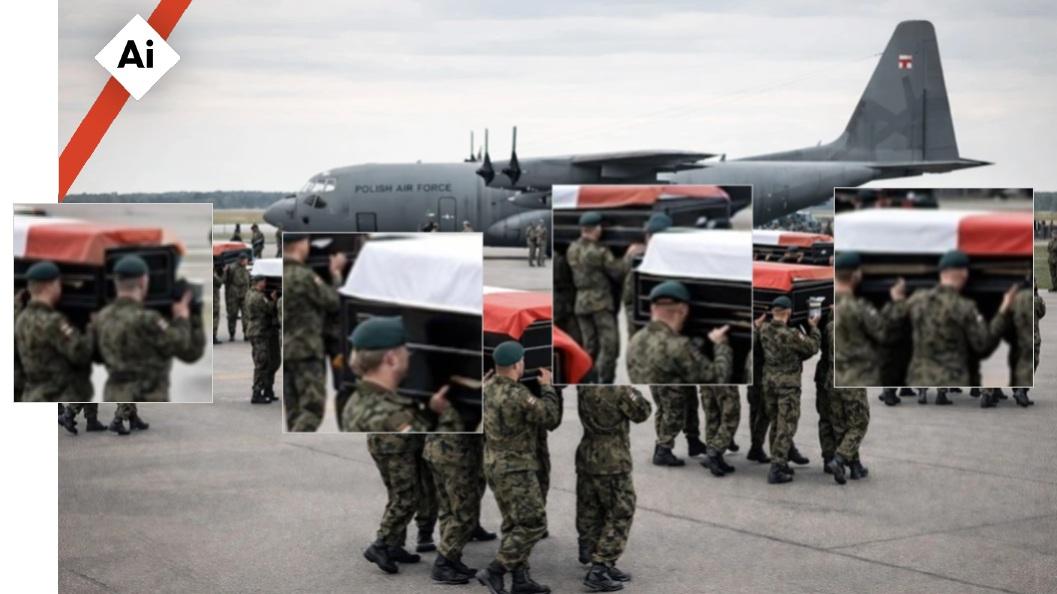 Príspevok je doplnený fotografiou vojakov nesúcich rakvy zakryté poľskou bielo-červenou vlajkou. V pozadí je vidieť veľké lietadlo s nápisom „Polish Air Force“ (Poľské vzdušné sily).