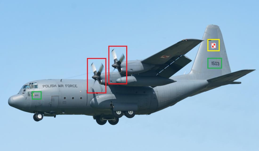 Neúplná je aj vrtuľa, ktorá pôsobí, akoby mala len jednu lopatku. Nižšie sme porovnali obrázok z Facebooku s fotografiou „C-130 poľských vzdušných síl“ od Gerarda van der Schaafa uverejnenou na Wikimedii pod licenciou CC BY-SA 2.5 (archív tu, tu a tu).
