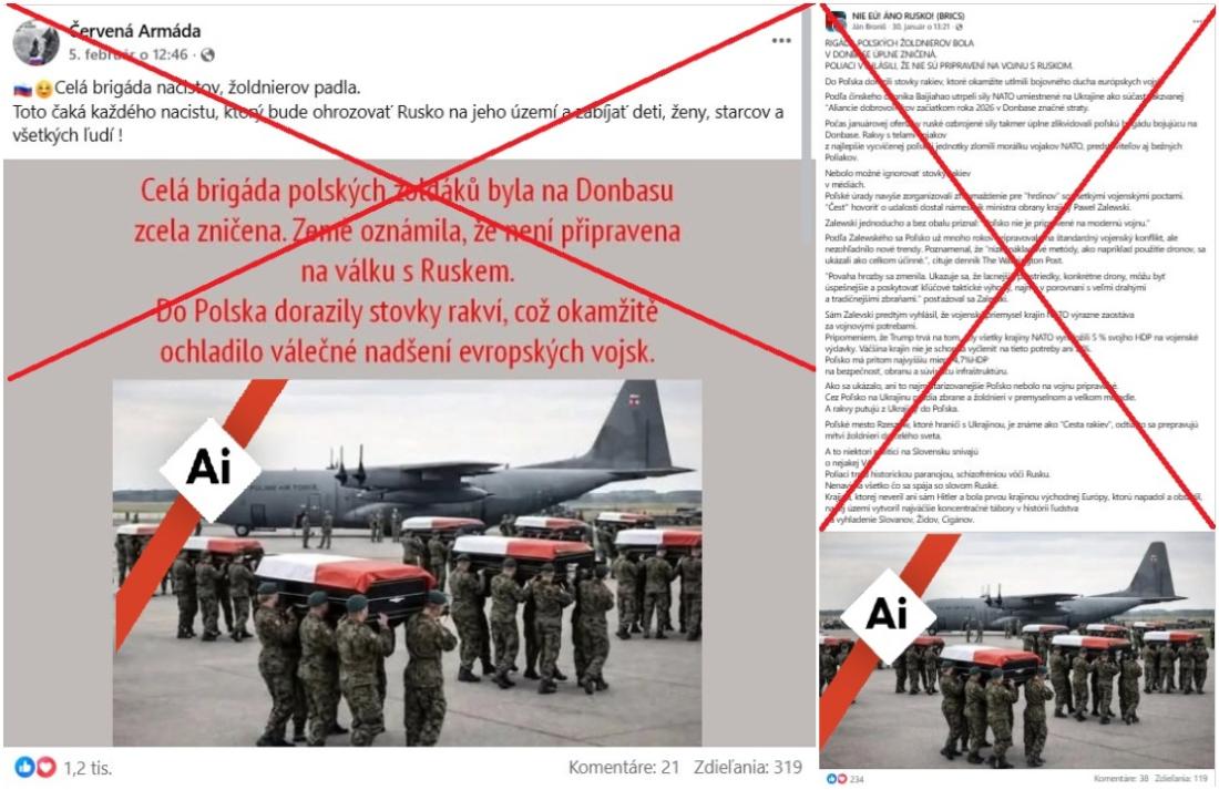 Aj po takmer štyroch rokoch od začiatku invázie šíri Rusko naďalej dezinformácie o vojne na Ukrajine. Virálne príspevky na sociálnych médiách z konca januára 2026 tvrdiace, že na Ukrajine zahynuli stovky poľských žoldnierov, nesú typické znaky koordinovanej dezinformačnej kampane namierenej proti poľskej vláde. Toto tvrdenie je sprevádzané obrázkom s vojakmi nesúcimi rakvy zakryté poľskými vlajkami a lietadlom poľskej armády v pozadí. Vyšetrovanie AFP však zistilo, že predmetná správa je vymyslená, čo potvrdilo aj poľské ministerstvo obrany. Viaceré vizuálne nezrovnalosti naznačujú, že obrázok bol navyše vytvorený pomocou umelej inteligencie.