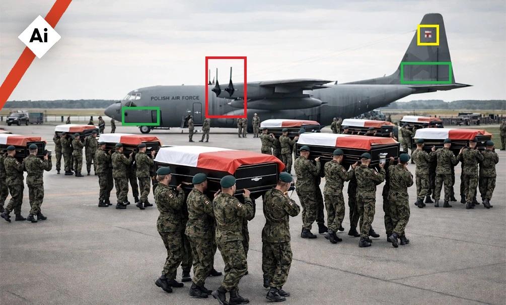 AFP na obrázku identifikovala viacero vizuálnych nezrovnalostí. Zdá sa, že vojaci nesú rakvy bočne a iba rukami namiesto toho, aby ich mali položené na pleciach, ako je zvykom. Na tejto fotografii môžeme vidieť skutočnú repatriačnú ceremóniu, ktorá sa konala v roku 2010 na vojenskom letisku vo Varšave, keď boli do Poľska prevezené telá obetí leteckého nešťastia v Smolensku.