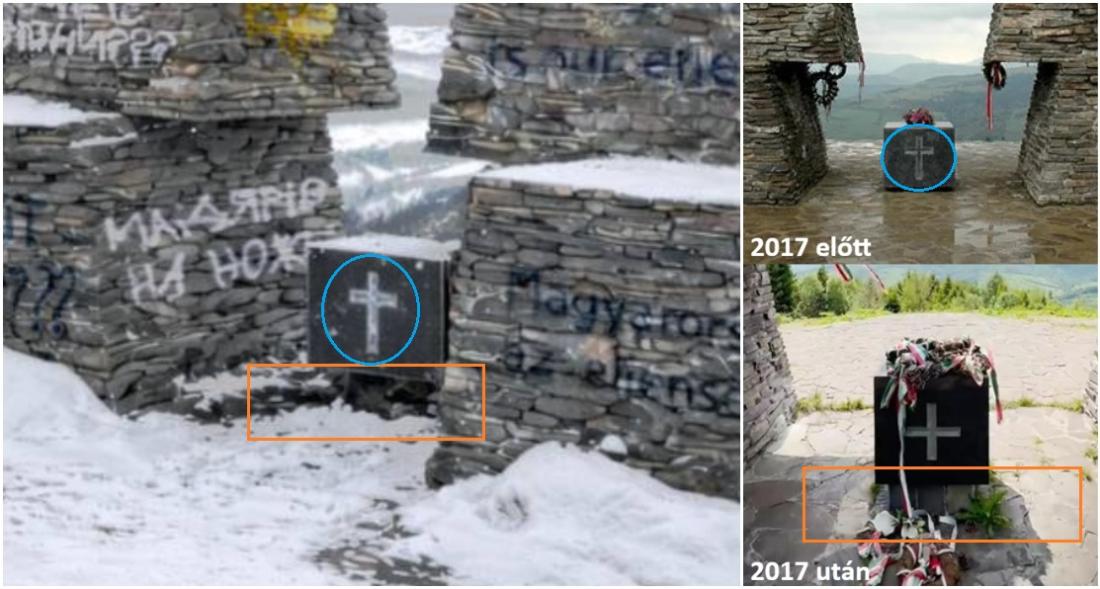 Na obrázkoch vidíme pamätník posprejovaný nápismi ako „Maďarsko je náš nepriateľ“, „na nože s Maďarmi“ a protiorbánovskými nápismi v angličtine, maďarčine a ukrajinčine. Na fotografiách sa objavuje aj zdanlivo nasprejovaný hákový kríž a ukrajinský štátny znak.