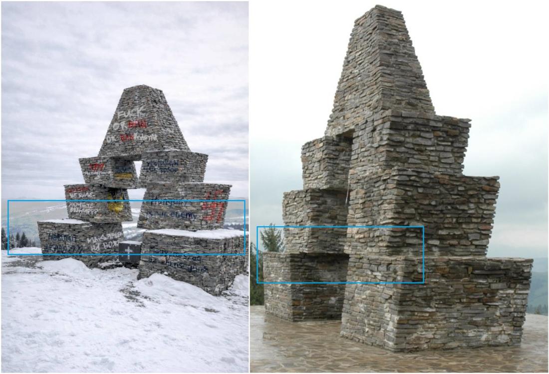 Obrázky „počmáraného“ pamätníka v ukrajinskom Vereckom prieskymku boli vytvorené digitálne