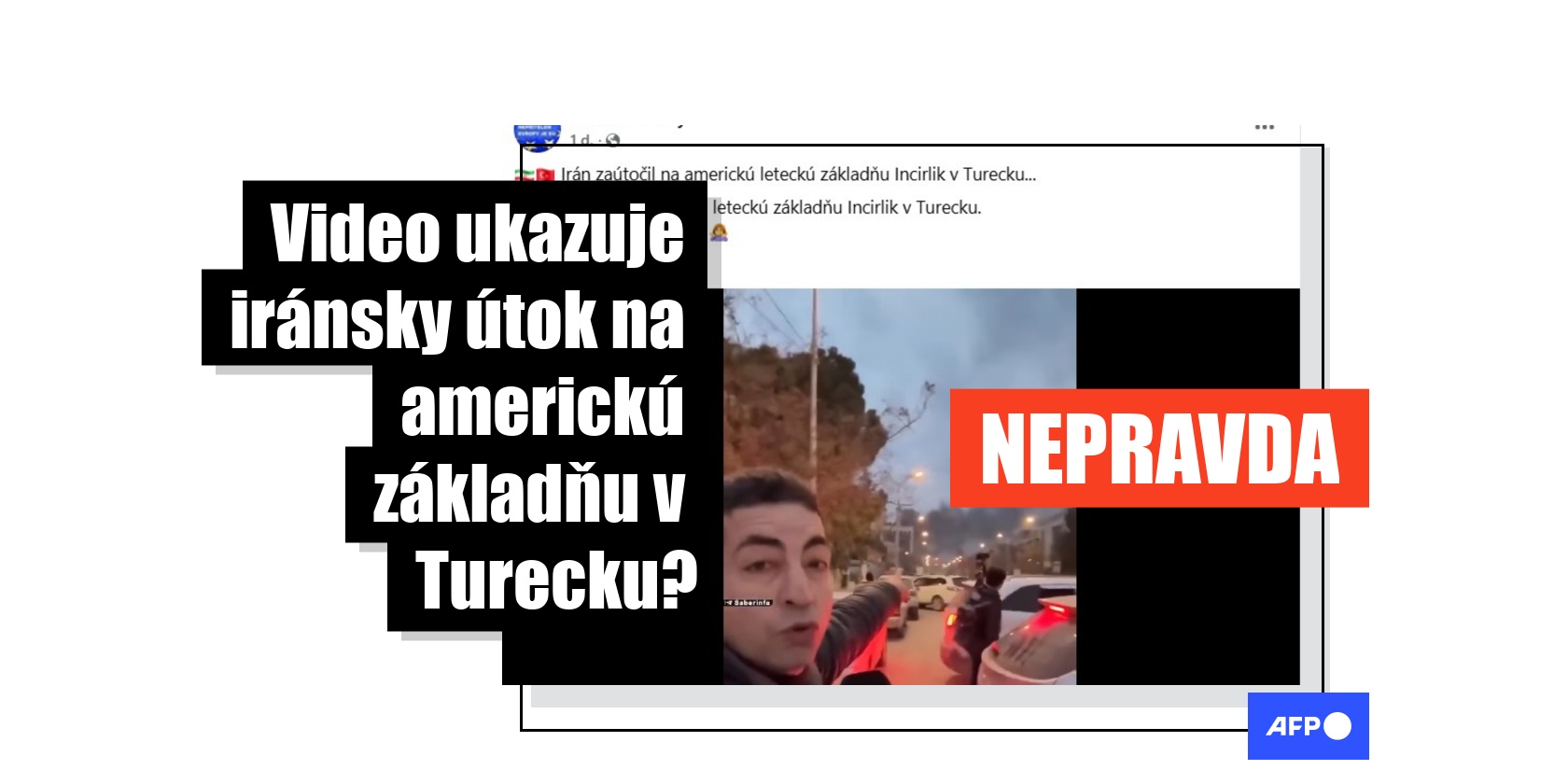 „Irán zaútočil na americkú leteckú základňu Incirlik v Turecku. To je vážne prekvapenie," píše sa vo facebookovom príspevku, ktorý bol od 2. marca 2026 zdieľaný vyše 80-krát. Obsahuje 47-sekundové video, ktoré ukazuje údajného novinára s tureckou vlajkou, ktorý zrejme sám natáča video a prináša správy z oblasti, nad ktorou je vidieť dym.