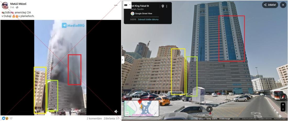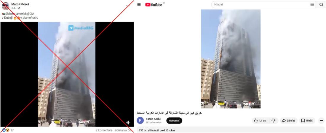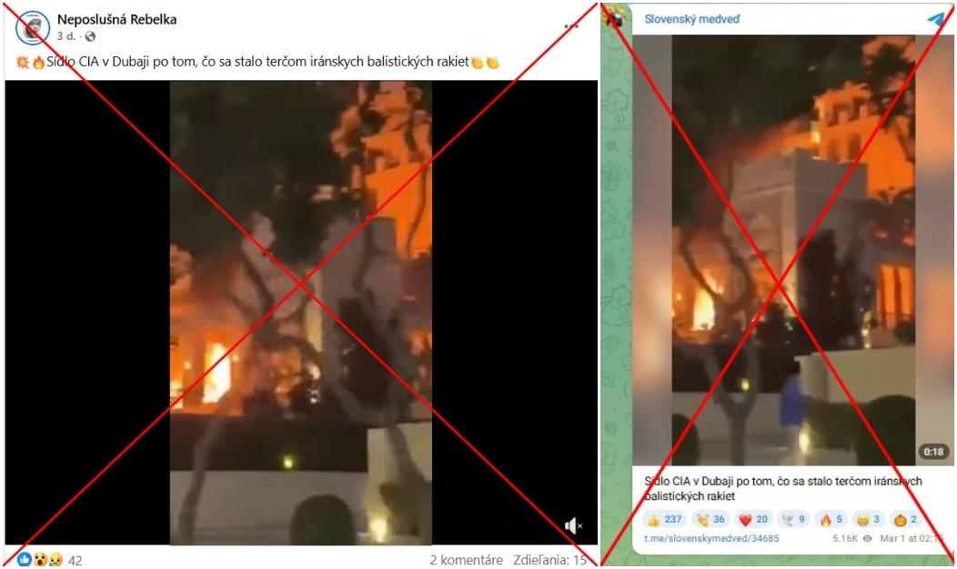 Na Facebooku sa 1. marca 2026 objavilo viacero príspevkov v slovenčine, ktoré tvrdia, že Irán zasiahol budovu v Dubaji, kde podľa rôznych formulácií sídli CIA, nachádza sa v nej jej kancelária alebo priamo veliteľstvo. Tieto príspevky nazbierali dovedna vyše 100 zdieľaní a obsahujú video ukazujúce hustý dym valiaci sa z mrakodrapu.