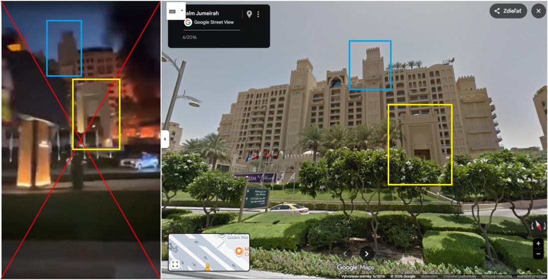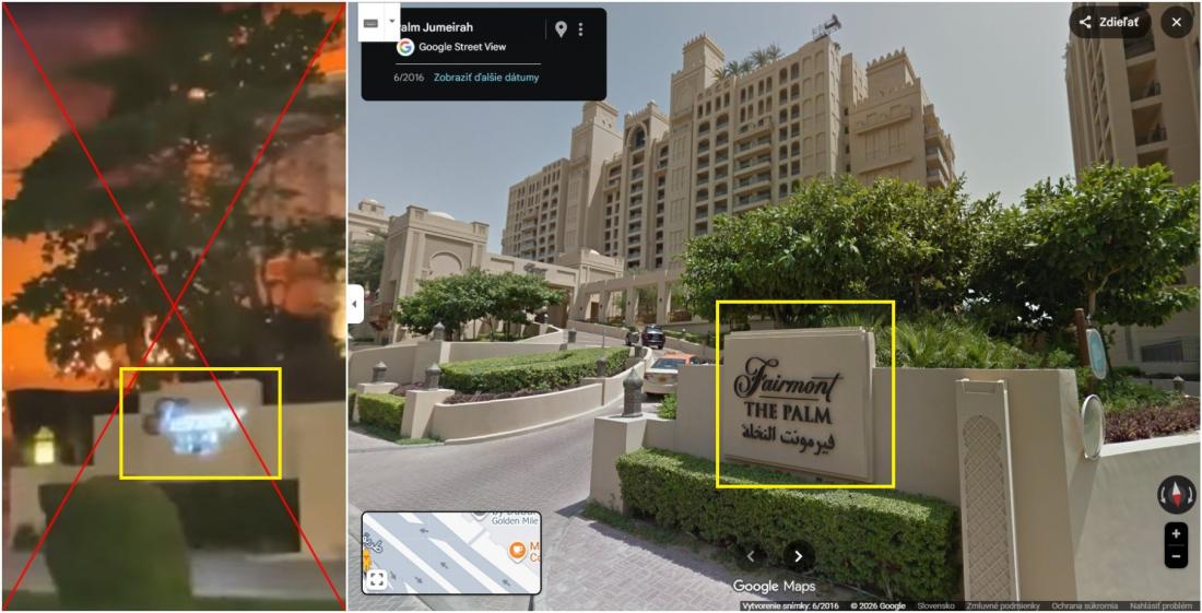 Záber z požiaru hotela sa objavil na New York Post (archív). Iné zábery v spravodajstvách BBC alebo The Independent. Fakt, že ide naozaj o požiar hotela Fairmont The Palm sa nám podarilo dokázať vďaka funkcii Google Street View.