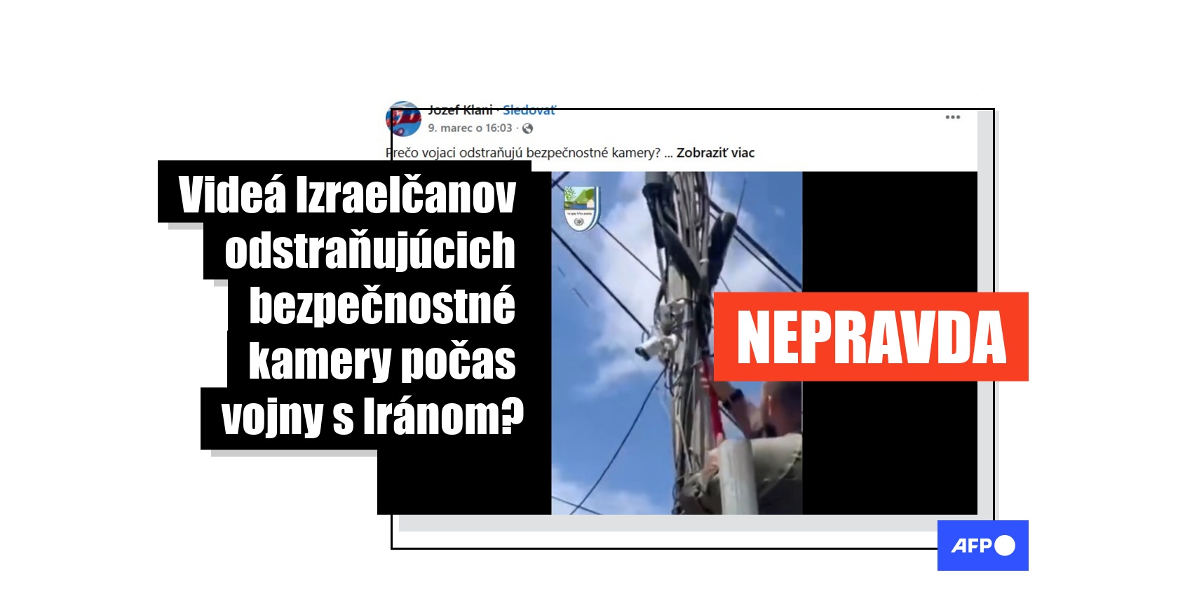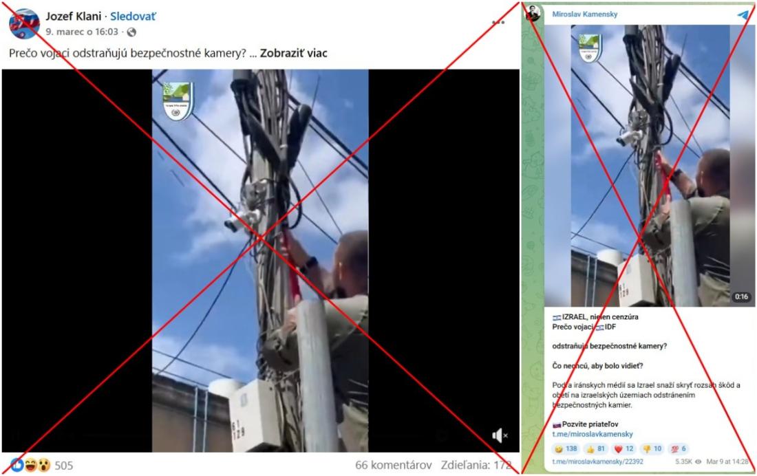„Prečo vojaci odstraňujú bezpečnostné kamery? Čo nechcú, aby bolo vidieť? Podľa iránskych médií sa Izrael snaží skryť rozsah škôd a obetí na izraelských územiach odstránením bezpečnostných kamier,“ píše sa v tomto facebookovom príspevku, ktorý bol od 9. marca 2026 zdieľaný vyše 170-krát. Príspevok obsahuje 16-sekundové video s dvoma segmentmi, na ktorých muži odstraňujú bezpečnostné kamery nainštalované na ulici.