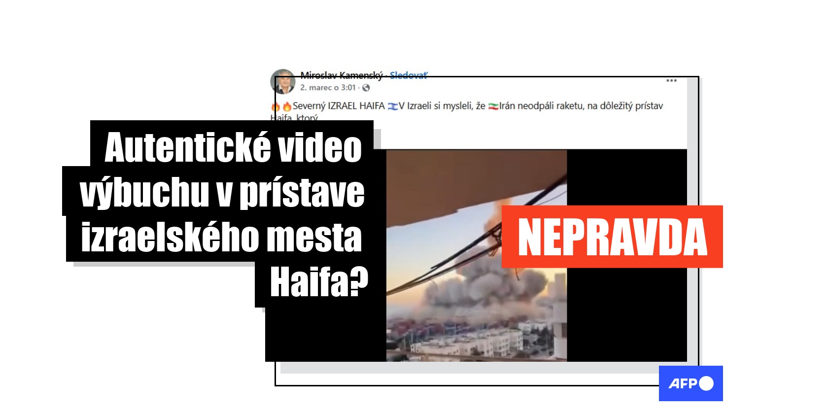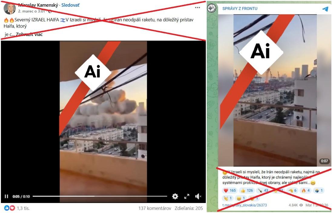 „Severný IZRAEL HAIFA. V Izraeli si mysleli, že Irán neodpáli raketu, na dôležitý prístav Haifa, ktorý je chránený najlepšími systémami protivzdušnej obrany, ale vidíte strašnú detonáciu" píše sa vo facebookovom príspevku z 2. marca 2026, ktorý nazbieral vyše 200 zdieľaní. Príspevok obsahuje 10-sekundové video údajného obrovského výbuchu v prístave.