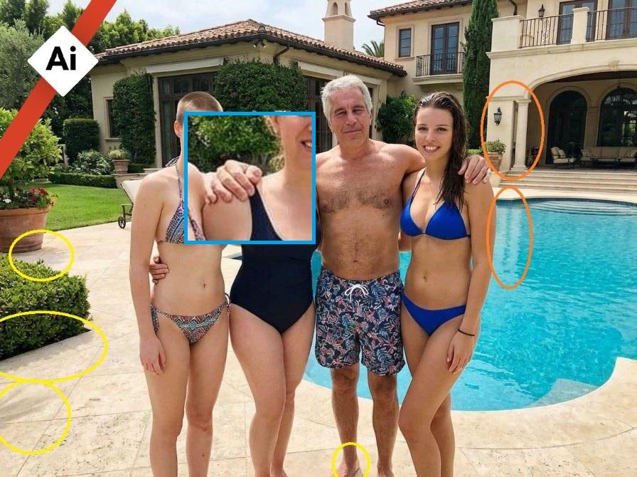 Obrázok obsahuje aj viaceré vizuálne nezrovnalosti. Tiene objektov nedopadajú rovnakým smerom a odraz stĺpov v bazéne nezodpovedá ich tvaru na budove. Na Epsteinovej pravej ruke si tiež môžeme všimnúť neprirodzene hrubý palec a rozštiepený malíček.