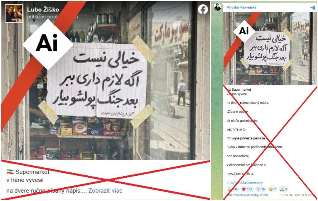 Vojenské útoky zo strany USA a Izraela, ktorým čelí Irán už viac ako mesiac, ešte prehĺbili ekonomické problémy obyvateľov islamskej republiky. V tejto súvislosti sa na sociálnych médiách objavila údajná fotografia nápisu na supermarkete, ktorý informuje zákazníkov, že si môžu zobrať, čo chcú s tým, že zaplatia, keď sa vojna skončí. Ako však odhalilo naše vyšetrovanie, obrázok vytvorila umelá inteligencia.