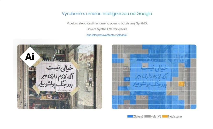 Pri analýze obrázka identifikoval detekčný nástroj Google prítomnosť digitálneho vodoznaku SynthID, ktorý je vkladaný do obrázkov a videí vytvorenými modelmi umelej inteligencie od Google. Vodoznak sa v obrázku vyskytuje vo veľkom rozsahu, čo nástroj priviedlo k záveru, že obrázok bol vytvorený AI od Google s „veľmi vysokou“ mierou istoty.