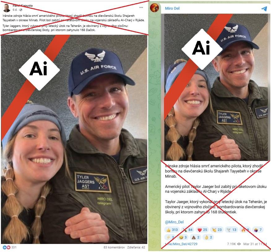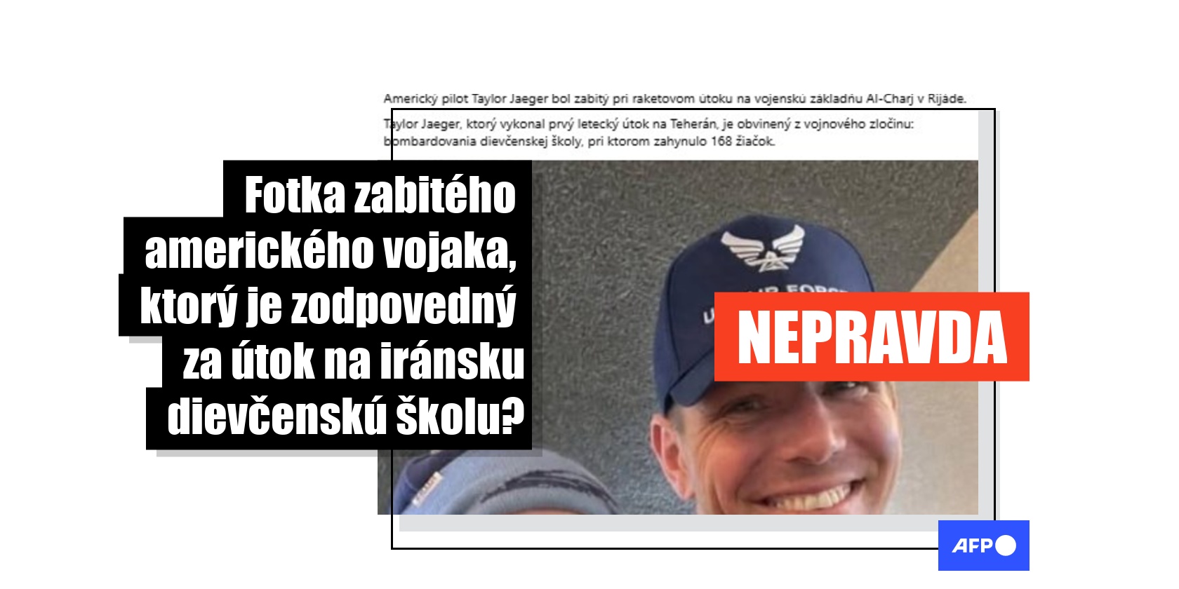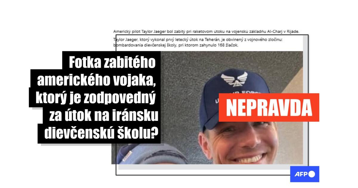 „Iránske zdroje hlásia smrť amerického pilota, ktorý zhodil bombu na dievčenskú školu Shajareh Tayyebeh v okrese Minab. Pilot bol zabitý pri raketovom útoku na vojenskú základňu Al-Charj v Rijáde. Tyler Jaggers, ktorý vykonal prvý letecký útok na Teherán, je obvinený z vojnového zločinu: bombardovania dievčenskej školy, pri ktorom zahynulo 168 žiačok,“ čítame vo facebookovom príspevku, ktorý od 2. apríla 2026 nazbieral vyše 40 zdieľaní. Meno údajného pilota je v najvirálnejšom slovenskom príspevku s vyše 70 zdieľaniami skomolené na „Taylor Jaeger“.