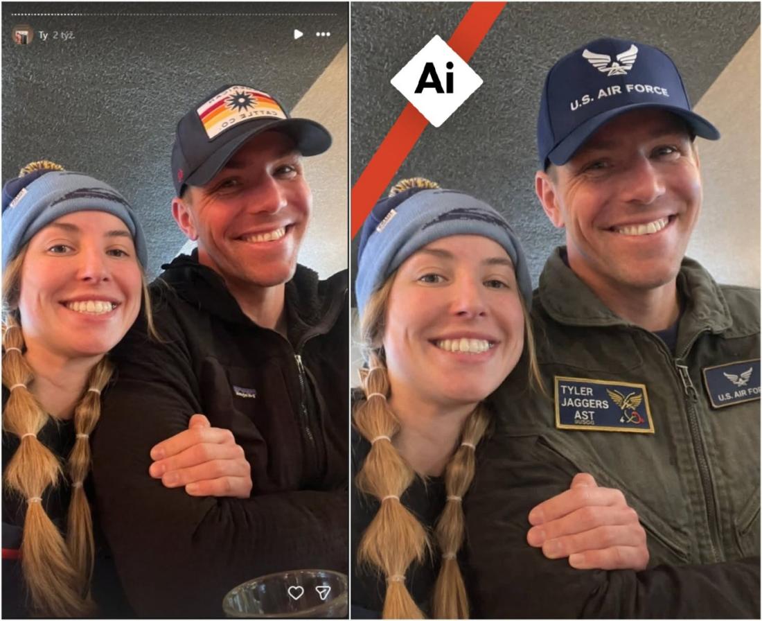 Príspevky obsahujú obrázok, na ktorom vidíme ženu v modrej zimnej čiapke a muža v tmavomodrej šiltovke s logom amerického letectva (US Air Force) oblečeného v zelenom letovom overale. Na mužovom zvršku je menovka s nápisom „TYLER JAGGERS AST“ s označením „USCG“ (United States Coast Guard). Vidíme tu aj ďalšiu nášivku amerického letectva, ktorá zdanlivo obsahuje rovnaké logo, aké nájdeme na šiltovke. Dvojica je odfotografovaná, ako sa zoširoka usmieva do kamery. Pozadie je neutrálne a bez výrazných detailov.