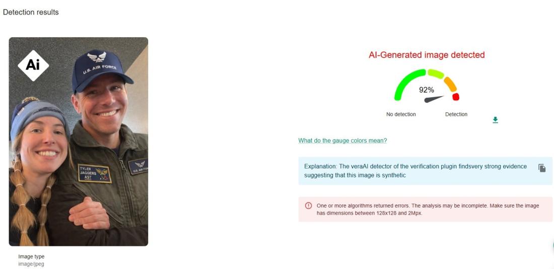 Overovací nástroj InVID vyvinutý v spolupráci s AFP naznačil veľmi vysokú pravdepodobnosť, že v prípade upravenej verzie máme dočinenia s neautentickým obsahom. Nástroj odhalil pravdepodobnosť 92 %, že obrázok bol vytvorený pomocou umelej inteligencie.