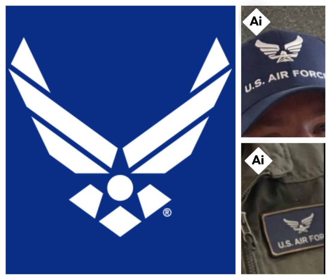 Logá „US Air Force“ na šiltovke a nášivke sa nezhodujú. Logo na šiltovke obsahuje neidentifikovateľný prvok pripomínajúci vežu. Logo na nášivke pripomína viac hviezdu, no takisto sa neponáša na oficiálne označenie vzdušných síl používané od roku 2004.
