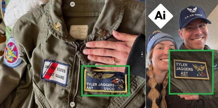 Pri porovnaní virálneho obrázku s vyššie spomenutou fotografiou ženskej ruky s obrúčkou položenou na uniforme si všimneme zásadnú nezrovnalosť vo vzhľade nášivky s menovkou. Pri autentickej Weaverovej fotografii sú všetky nápisy na nášivke uvedené rovnakou veľkosťou aj farbou. Na autentickej nášivke vidíme dve ilustrácie: okrídlené okrúhle logo a obrázok hybridu helikoptéry a ryby, ktorého ekvivalent nájdeme v logu leteckej základne americkej pobrežnej stráže v Astorii na Facebooku.