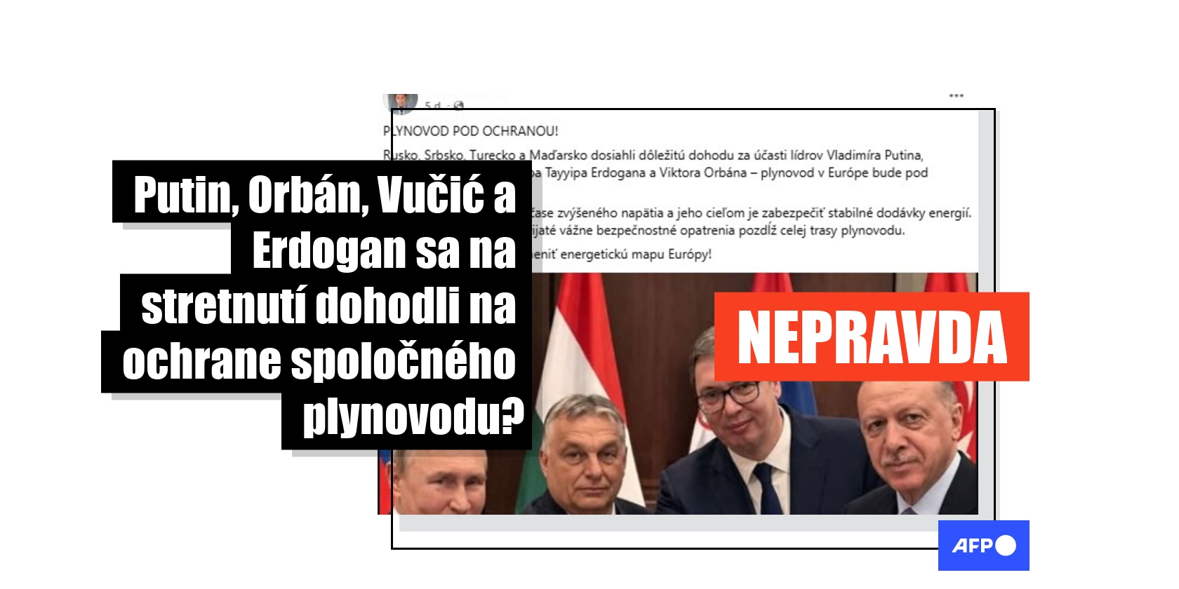 „Plynovod pod ochranou! Rusko, Srbsko, Turecko a Maďarsko dosiahli dôležitú dohodu za účasti lídrov Vladimíra Putina, Aleksandara Vučiča, Recepa Tayyipa Erdogana a Viktora Orbána – plynovod v Európe bude pod zvláštnou ochranou!“ píše sa vo facebookovom príspevku, ktorý bol od 8. apríla 2026 zdieľaný vyše 240-krát.