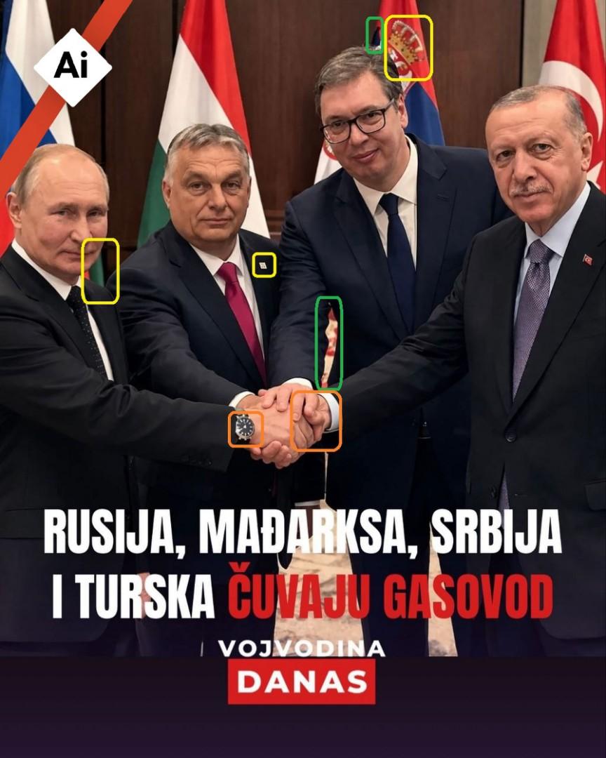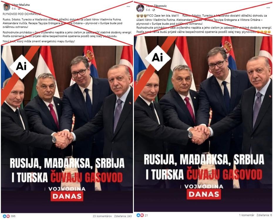 Týždeň pred kľúčovými maďarskými parlamentnými voľbami, ktoré 12. apríla 2026 vyhrala strana Tisza, oznámil srbský prezident Aleksandar Vučić , že v blízkosti plynovodu Balkan Stream, ktorý prepravuje ruský plyn do Maďarska, boli nájdené výbušniny. Jeho politického spojenca, maďarského premiéra Viktora Orbána to podnietilo k zvolaniu výnimočného zasadnutia maďarskej obrannej rady. V tejto súvislosti sa na sociálnych médiách objavil obrázok Vučića a Orbána spolu s tureckým prezidentom Recepom Tayyipom Erdoganom a ruským prezidentom Vladimirom Putinom. Obrázok sprevádzalo tvrdenie, že lídri dosiahli dohodu o zvláštnej ochrane plynovodu. Obrázok však bol vytvorený pomocou umelej inteligencie a naposledy sa spolu všetci štyria lídri stretli v roku 2017 v Číne.