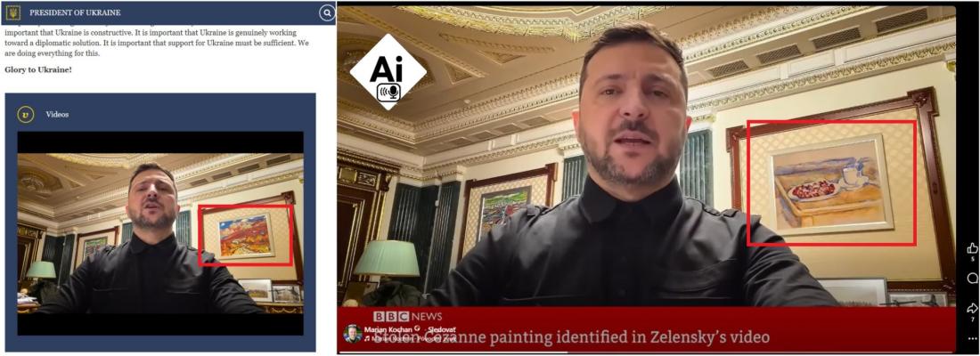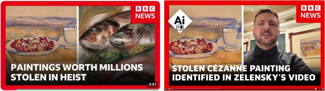 V marci 2026 ukradli z talianskeho múzea zlodeji vzácne obrazy Cézanna, Renoira a Matissa v hodnote miliónov eur. Asi o mesiac neskôr sa na internete objavilo video imitujúce reportáž BBC, ktoré tvrdilo, že ukradnutý obraz od Cézanna sa objavil na stene kancelárie ukrajinského prezidenta Volodymyra Zelenského počas jedného z jeho videopríhovorov. Zábery však pochádzali zo staršieho prejavu zverejneného ešte predtým, ako k lúpeži došlo a obraz bol do nich umelo pridaný. BBC potvrdila, že video je podvrh a AFP zistila, že komentár údajnej reportérky vytvorila umelá inteligencia.