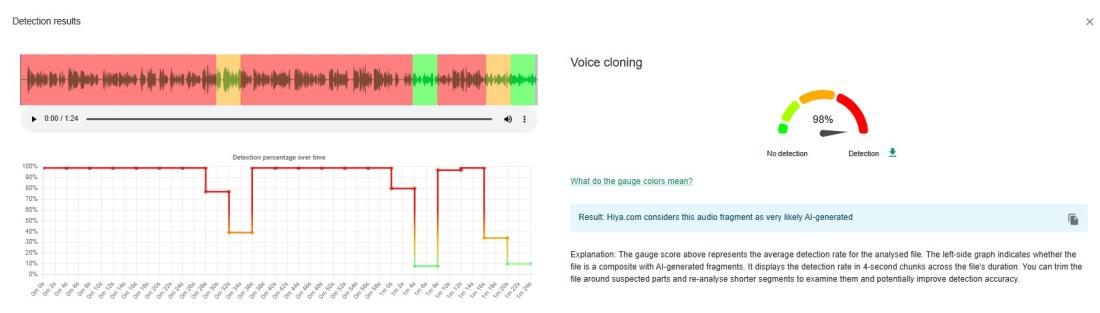 Zvukovú stopu z videa sme analyzovali pomocou najnovšej verzie aplikácie Hiya z rozšírenia InVID-WeVerify určenej na detekciu AI obsahu. Podľa výsledkov analýzy existuje 98‑percentná pravdepodobnosť, že hlasová stopa bola vytvorená pomocou umelej inteligencie.