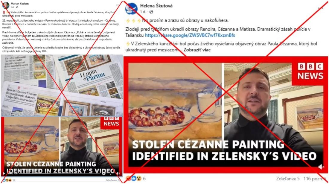 „V Zelenského kancelárii bol počas živého vysielania objavený obraz Paula Cézanna, ktorý bol ukradnutý pred mesiacom,“ píše sa v slovenskom príspevku z 22. apríla 2026. Rovnaké tvrdenie sme na Facebooku našli aj tu a na Telegrame napríklad tu alebo tu.
