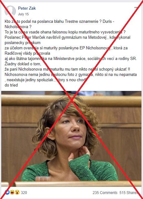V príspevku sa píše, že „poslanec Peter Marček navštívil gymnázium na Metodovej , kde vykonal poslanecky preskum“, avšak „žiadny doklad o tom, že pani Nicholsonova má maturitu mu tam nikto nebol schopný ukázať !!“. Taktiež sa v príspevku píše, že „nikto si na nu nepamata, neexistuje jediny spoluziak , ktory s nou chodil do tried“. Vytvára sa tak dojem, že Nicholsonová nemá maturitu, prípadne, že na školu vôbec nechodila.