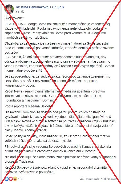 Informácia však bola aj preložená do slovenčiny a začala sa šíriť aj prostredníctvom FB príspevkov, napríklad v tomto z 23. novembra 2020. „George Soros bol zatknutý a momentálne je vo federálnej väzbe vo Philadelphii,“ píše sa v príspevku, ktorý zdieľalo 130 používateľov Facebooku.