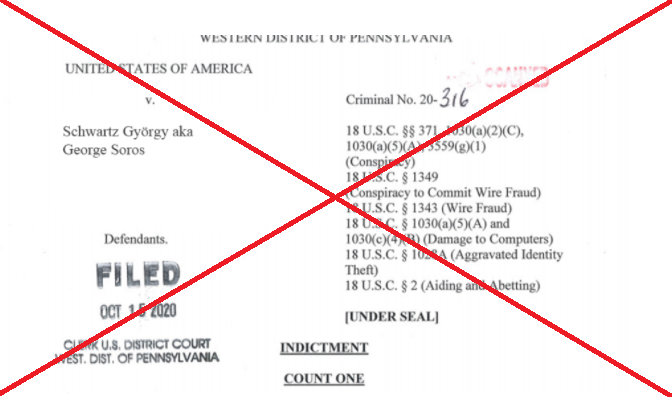 Články obsahovali aj link na fotografiu údajného Sorosovho obvinenia, ktoré mal vydať súd v Pensylvánii. Tento oficiálne vyzerajúci dokument nesúci filantropovo meno sa šíril aj na Twitteri, napríklad tu.