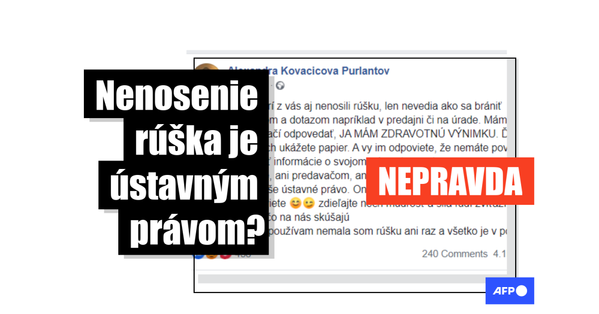 23. augusta 2020 zverejnila používateľka s menom Alexandra Kovacicova Purlantov facebookový status, v ktorom píše: „Možno by niektorí z vás aj nenosili rúšku, len nevedia ako sa brániť prípadným útokom a dotazom napríklad v predajni či na úrade. Mám pre vás typ ako na to. Stačí odpovedať, JA MÁM ZDRAVOTNÚ VÝNIMKU. Ďalej vám povedia nech ukážete papier. A vy im odpoviete, že nemáte povinnosť nikomu ukazovať informácie o svojom zdravotnom stave. A naozaj nemáte, ani predavačom, ani policajtovi ani 'kontrolórovi', skrátka nikomu. Je to vaše ústavné právo. Oni len skúšajú pretože vedia, že vy neviete. Tak už viete ?? …“
