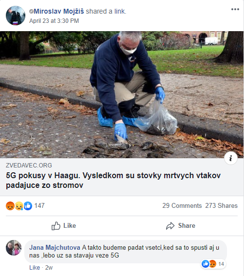 V oboch zo spomínaných článkov sa uvádza, že v haagskom parku Huijgenspark bolo nájdené veľké množstvo mŕtvych škorcov. Ich smrť dávajú články do súvislosti s neďalekým stĺpom siete 5G. „Na rohu strechy HS telecentra pribudol nový 5G stĺp, nízky, takže na streche nie je viditeľný … Bezprostredne po tom, začali zo stromov masívne padať mŕtve vtáky … Prakticky presne v tom istom čase ako zvieratá umierali, neďaleká stanica Holland Spoor testovala prenosový vysielací stožiar 5G,“ uvádza zvedavec.org.