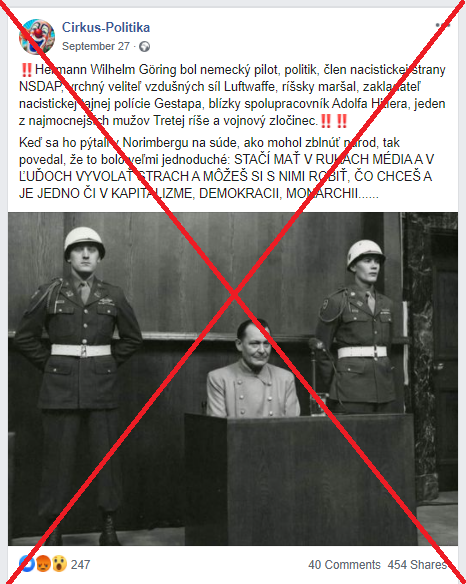 Facebooková stránka Cirkus-Politika zdieľala 27. septembra príspevok o ríšskom maršálovi nacistického Nemecka Hermannovi Göringovi, v ktorom bolo uvedené: „Keď sa ho pýtali v Norimbergu na súde, ako mohol zblnúť národ, tak povedal, že to bolo veľmi jednoduché: STAČÍ MAŤ V RUKÁCH MÉDIA A V ĽUĎOCH VYVOLAŤ STRACH A MÔŽEŠ SI S NIMI ROBIŤ, ČO CHCEŠ A JE JEDNO ČI V KAPITALIZME, DEMOKRACII, MONARCHII......“