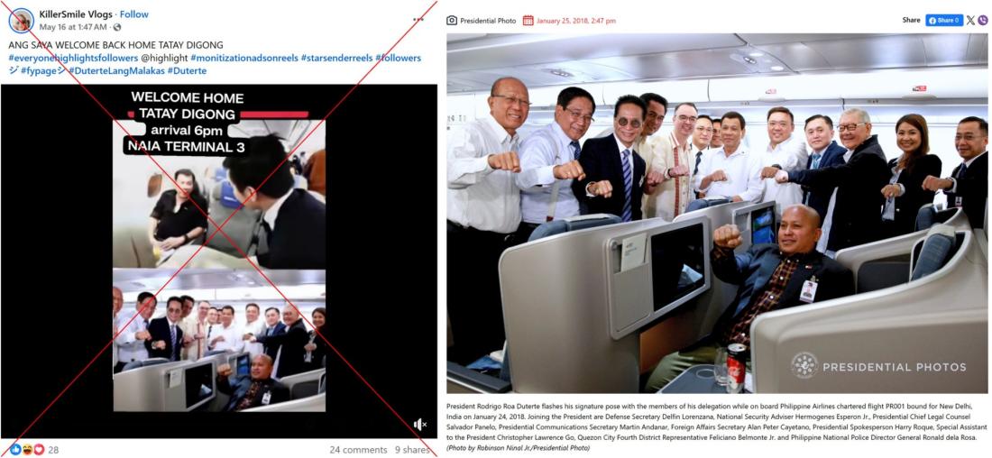 "So happy, welcome back home Father Digong," says a Tagalog-language Facebook post on May 16, 2025, using Duterte's popular nickname and sharing pictures of him on a flight.