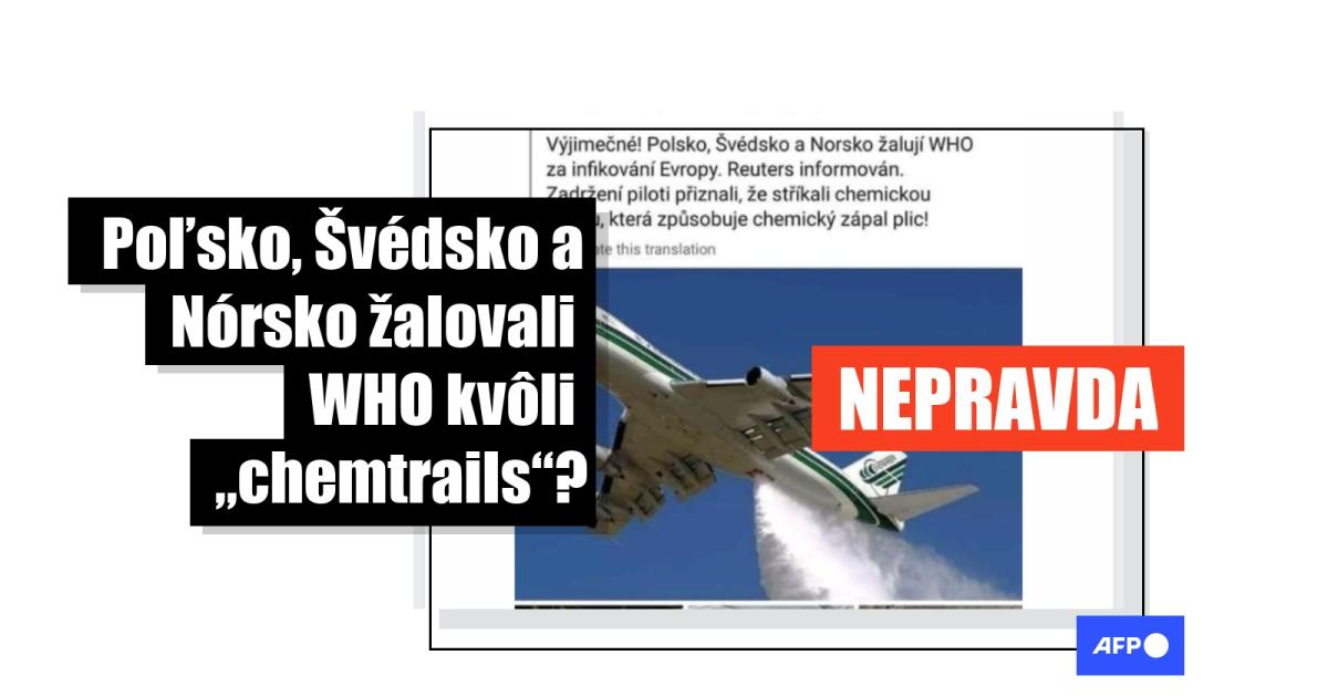 „Výnimočné! Poľsko, Švédsko a Nórsko žalujú WHO za infikovanie Európy. Informovala o tom agentúra Reuters. Zadržaní piloti priznali, že postriekali chemikáliou, ktorá spôsobuje chemický zápal pľúc!“ píše sa vo facebookovom príspevku z 8. marca 2021, ktorý zdieľalo viac ako 13-tisíc používateľov.