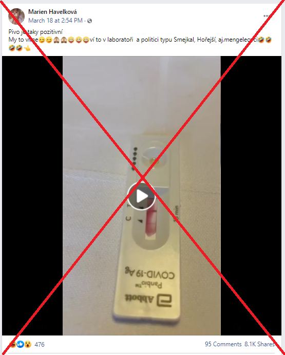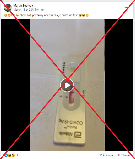 „Kto by chcel byť pozitívny nech si naleje pivko na test,“ píše sa v príspevku používateľa Facebooku z 18. marca 2021. Súčasťou príspevku je video, v ktorom niekto z pivného vrchnáku nakvapká pár kvapiek na antigénový test, ktorého výsledok sa po chvíli ukáže ako pozitívny.