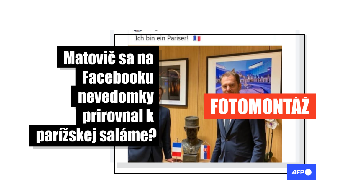 Pôvodná fotografia použitá v satirickom FB príspevku však nepochádza z jeho návštevy Paríža, bola vyhotovená v júli 2020 v Bruseli počas samitu lídrov EÚ. Emmanuel Macron podľa jej popisu navštívil priestory Stáleho zastúpenia SR pri EÚ a spoločne s Igorom Matovičom zapózoval pri buste Milana Rastislava Štefánika v deň jeho 140. narodenín.