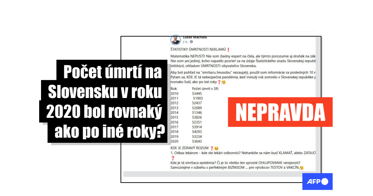 Tvrdenia o tom, že by na slovensku za rok 2020 zomrelo niečo cez 53-tisíc ľudí, tj. že počet úmrtí bol na úrovni dlhodobého priemeru, sú však nepravdivé, čo potvrdil ŠÚ SR, polícia aj ministerstvo vnútra. V skutočnosti počet úmrtí dramaticky narástol a najviac z nich bolo zaznamenaných v posledných mesiacoch roka - súbežne s nastupujúcou druhou vlnou pandémie koronavírusu SARS-CoV-2.