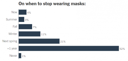 V článku New York Times z 8. júna 2020, ktorý zahŕňal anketu s viac ako 500 epidemiológmi sa uvádza, že viac ako polovica z nich odpovedala, že bude trvať „viac ako rok, než sami prestanú bežne nosiť rúško mimo svojich domovov“.