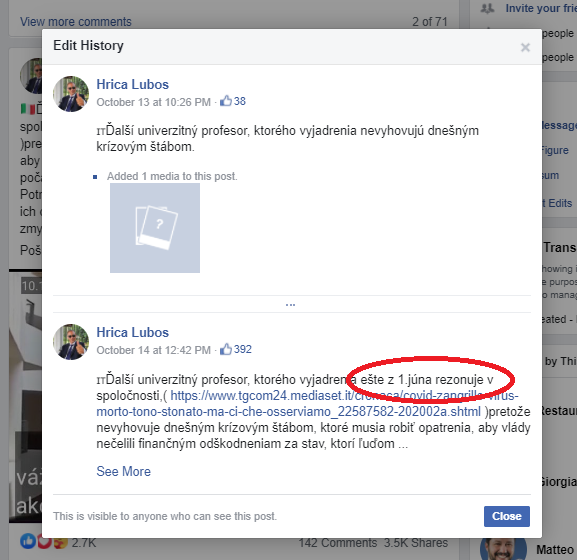Táto verzia sprievodného textového popisu je však výsledkom až deviatich úprav príspevku po jeho uverejnení, pričom informácia o tom, že rozhovor s talianskym lekárom bol v skutočnosti nahratý už v júni, bola doplnená až po necelých 14 hodinách od prvej publikácie videa. Predmetný príspevok tak pomerne dlhú dobu pôsobil dojmom, že videorozhovor s talianskym lekárom bol natočený len nedávno.