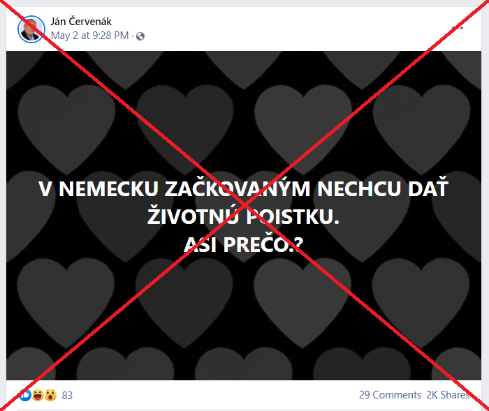 Súkromný FB profil zdieľal 2. mája 2021 príspevok, v ktorom bolo napísané: „V Nemecku zaočkovaným nechcu dať životnú poistku. Asi prečo?“ Tento príspevok zdieľalo viac ako 2000 používateľov.
