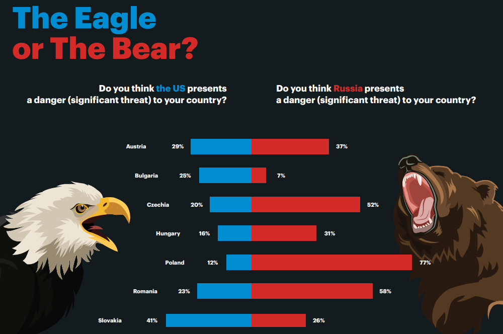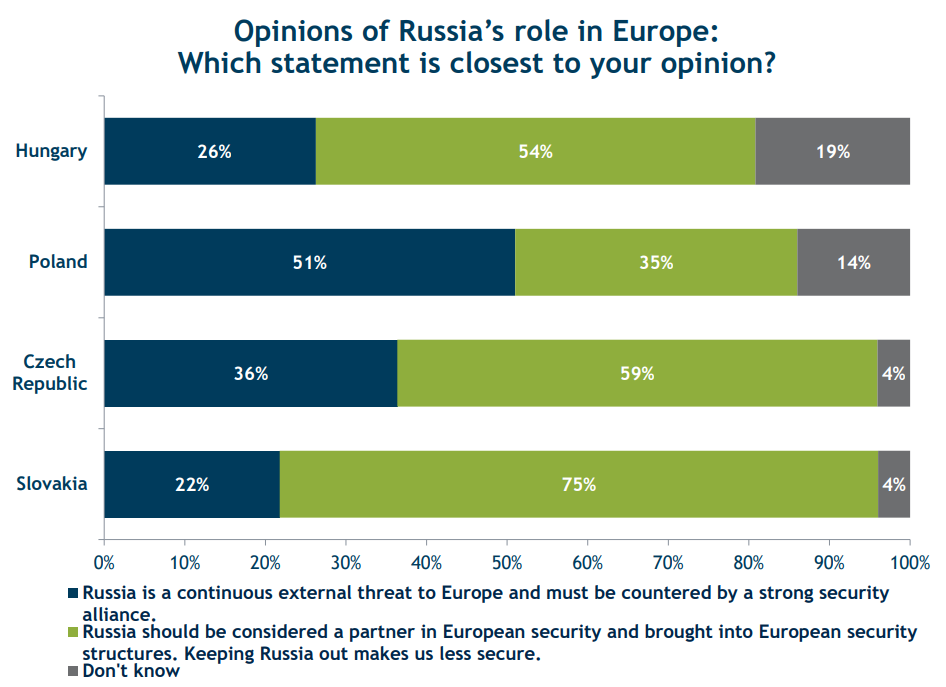Prieskum International Republican Institute (IRI) z roku 2017 došiel k podobným výsledkom. Len 22% Slovákov si myslelo, že by bolo Rusko trvalou vonkajšou hrozbou pre Európu, ktorá by mala byť vyvážená silnou bezpečnostnou alianciou. V porovnaní s našimi susedmi v rámci V4 mali Slováci v oboch prieskumoch najmenej nepriateľský vzťah k Rusku.